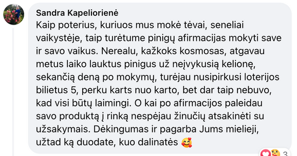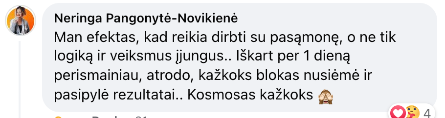 Buvo laikas kai gyvenu aukos vaidmenyje: pykau, kaltinau, pavydėjau ir t.t. ėjau per gyvenimą, nešdama neigiamų emocijų maišus. Ar buvo lengva gyventi? Veikti? Kurti? Tikrai, ne! Domėjimasis saviugda padėjo ne tik paleisti tuos maišus, bet ir pradėti kurti gyvenimą tokį, kokio aš noriu, kiekvieną dieną. Aš galiu rinktis ką galvoju, ką jaučiu, kaip reaguoju, nes aš esu savo gyvenimo šeimininkė. Tad dabar padedu ir kitiems jaustis gerai ne tik iš vidaus, bet ir iš išorės.